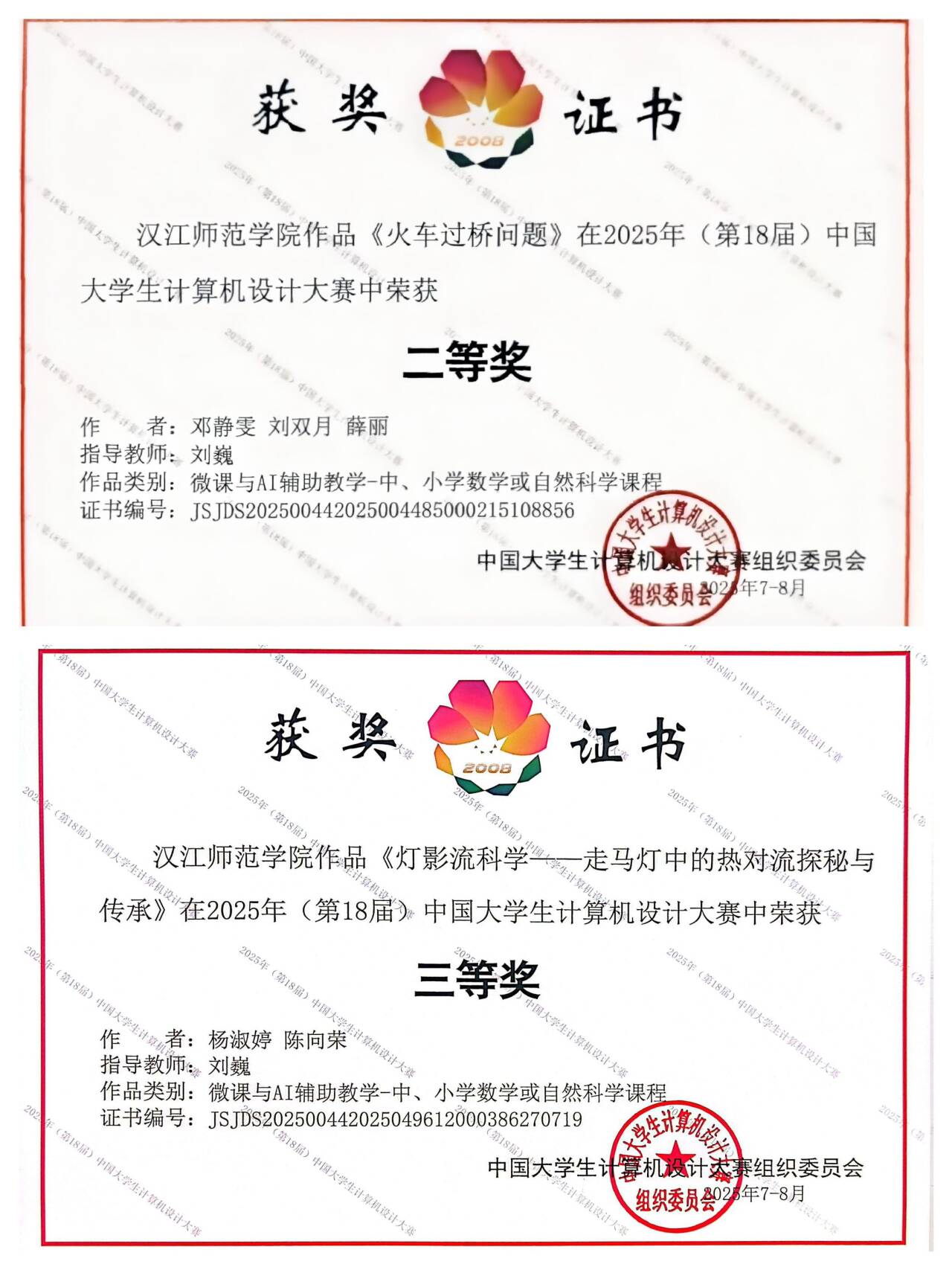 今年,我校共有2件作品经中南赛区推荐进入了微课与AI辅助教学的国赛决赛。邓静雯、刘双月、薛丽同学的作品《火车过桥问题》紧密结合实际场景,在问题分析的严谨性,解决方案的实用性以及逻辑推导的清晰性等方面展现了突出能力,细节丰富、角度全面,获得了二等奖。杨淑婷,陈向荣同学的作品《灯影流科学——走马灯中的热对流探秘与传承》充分将热对流科学知识与生活场景深度融合,通过设计直观实验和趣味讲解,帮助学生清晰认识热对流原理,兼具科学性与趣味性,获得了三等奖。